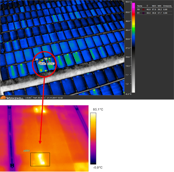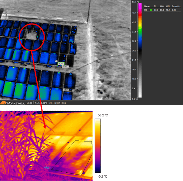 3. Revisión de puntos calientes en paneles FV e instalaciones eléctricas. Uso de cámaras termográficas en tierra y a bordo de DRONES. Análisis termográfico aéreo en instalación de 100 kW en la provincia de Cádiz.